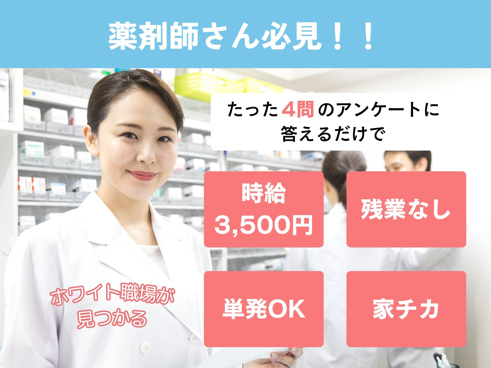 - 残業がなく、まとめて休みの取れる働き方が出来ないかと登録しました。いくつかの薬局で勤務しましたが、どこの薬局も残業なしで働けて休みもまとめて取れるようになり、当初の目的通りプライベートな時間を充実させることが出来ました